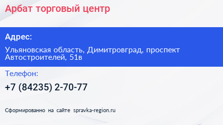 Арбат, торговый центр по адресу Ульяновская область, Димитровград, проспект Автостроителей, 51в в дальнейшем Организация, размещена в следующих категориях: