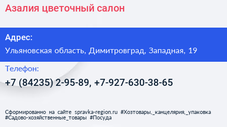 Азалия, цветочный салон по адресу Ульяновская область, Димитровград, Западная, 19 в дальнейшем Организация, размещена в следующих категориях: