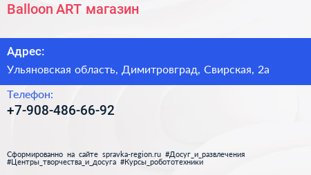 Balloon-ART, магазин по адресу Ульяновская область, Димитровград, Свирская, 2а в дальнейшем Организация, размещена в следующих категориях: