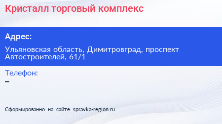 Кристалл, торговый комплекс по адресу Ульяновская область, Димитровград, проспект Автостроителей, 61/1 в дальнейшем Организация, размещена в следующих категориях: