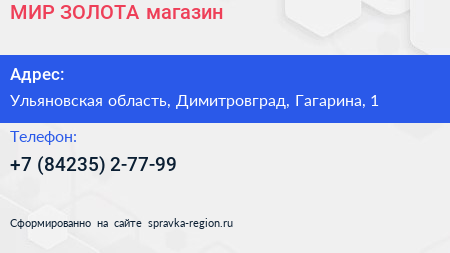МИР ЗОЛОТА, магазин по адресу Ульяновская область, Димитровград, Гагарина, 1 в дальнейшем Организация, размещена в следующих категориях: