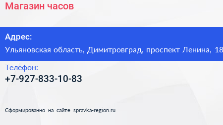 Магазин часов по адресу Ульяновская область, Димитровград, проспект Ленина, 18 в дальнейшем Организация, размещена в следующих категориях: