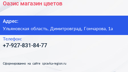 Оазис, магазин цветов по адресу Ульяновская область, Димитровград, Гончарова, 1а в дальнейшем Организация, размещена в следующих категориях: