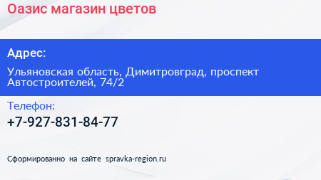 Оазис, магазин цветов по адресу Ульяновская область, Димитровград, проспект Автостроителей, 74/2 в дальнейшем Организация, размещена в следующих категориях: