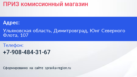 ПРИЗ, комиссионный магазин по адресу Ульяновская область, Димитровград, Юнг Северного Флота, 107 в дальнейшем Организация, размещена в следующих категориях: