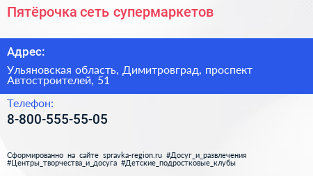 Пятёрочка, сеть супермаркетов по адресу Ульяновская область, Димитровград, проспект Автостроителей, 51 в дальнейшем Организация, размещена в следующих категориях: