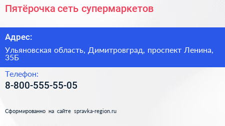 Пятёрочка, сеть супермаркетов по адресу Ульяновская область, Димитровград, проспект Ленина, 35Б в дальнейшем Организация, размещена в следующих категориях: