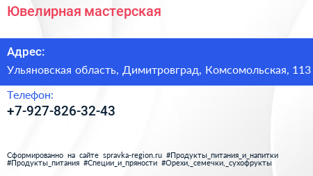 Ювелирная мастерская по адресу Ульяновская область, Димитровград, Комсомольская, 113 в дальнейшем Организация, размещена в следующих категориях:
