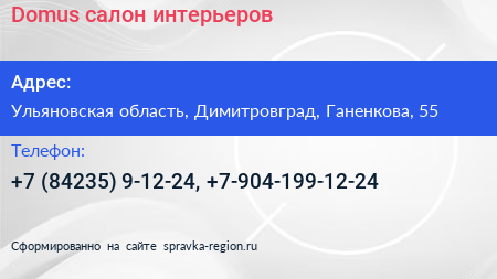 Domus, салон интерьеров по адресу Ульяновская область, Димитровград, Ганенкова, 55 в дальнейшем Организация, размещена в следующих категориях: