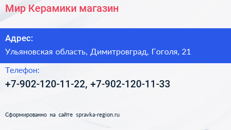 Мир Керамики, магазин по адресу Ульяновская область, Димитровград, Гоголя, 21 в дальнейшем Организация, размещена в следующих категориях: