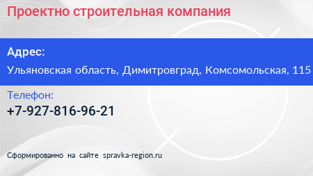 Проектно-строительная компания по адресу Ульяновская область, Димитровград, Комсомольская, 115 в дальнейшем Организация, размещена в следующих категориях: