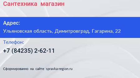 Сантехника+, магазин по адресу Ульяновская область, Димитровград, Гагарина, 22 в дальнейшем Организация, размещена в следующих категориях: