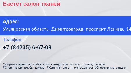 Бастет, салон тканей по адресу Ульяновская область, Димитровград, проспект Ленина, 14 в дальнейшем Организация, размещена в следующих категориях: