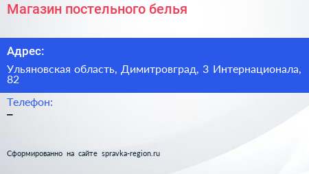 Магазин постельного белья по адресу Ульяновская область, Димитровград, 3 Интернационала, 82 в дальнейшем Организация, размещена в следующих категориях: