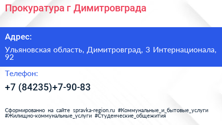 Прокуратура г. Димитровграда по адресу Ульяновская область, Димитровград, 3 Интернационала, 92 в дальнейшем Организация, размещена в следующих категориях:
