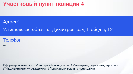 Участковый пункт полиции №4 по адресу Ульяновская область, Димитровград, Победы, 12 в дальнейшем Организация, размещена в следующих категориях: