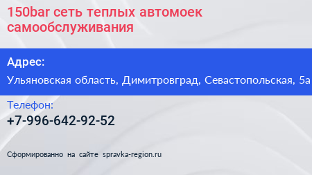 150bar, сеть теплых автомоек самообслуживания по адресу Ульяновская область, Димитровград, Севастопольская, 5а в дальнейшем Организация, размещена в следующих категориях: