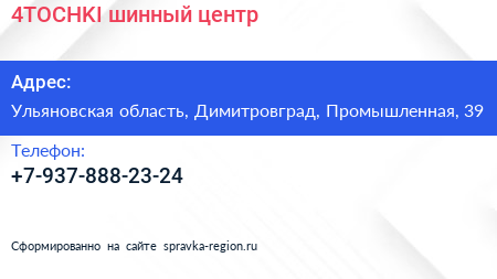 4TOCHKI, шинный центр по адресу Ульяновская область, Димитровград, Промышленная, 39 в дальнейшем Организация, размещена в следующих категориях: