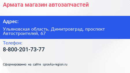Армата, магазин автозапчастей по адресу Ульяновская область, Димитровград, проспект Автостроителей, 67 в дальнейшем Организация, размещена в следующих категориях: