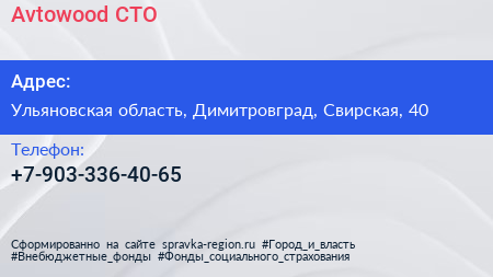 Avtowood, СТО по адресу Ульяновская область, Димитровград, Свирская, 40 в дальнейшем Организация, размещена в следующих категориях: