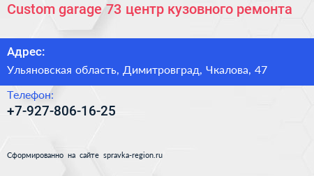 Custom garage 73, центр кузовного ремонта по адресу Ульяновская область, Димитровград, Чкалова, 47 в дальнейшем Организация, размещена в следующих категориях: