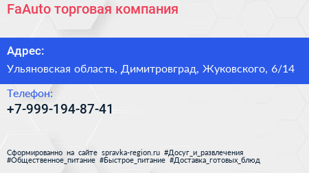 FaAuto, торговая компания по адресу Ульяновская область, Димитровград, Жуковского, 6/14 в дальнейшем Организация, размещена в следующих категориях: