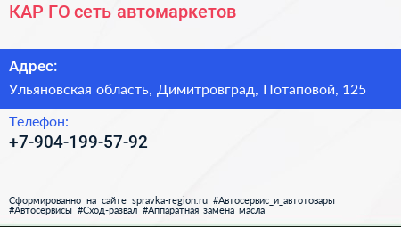 КАР-ГО, сеть автомаркетов по адресу Ульяновская область, Димитровград, Потаповой, 125 в дальнейшем Организация, размещена в следующих категориях: