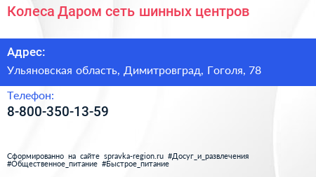 Колеса Даром, сеть шинных центров по адресу Ульяновская область, Димитровград, Гоголя, 78 в дальнейшем Организация, размещена в следующих категориях: