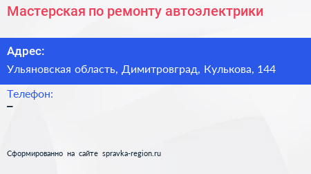 Мастерская по ремонту автоэлектрики по адресу Ульяновская область, Димитровград, Кулькова, 144 в дальнейшем Организация, размещена в следующих категориях: