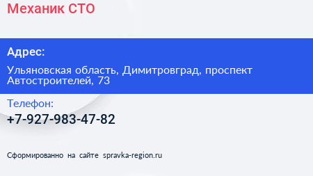 Механик, СТО по адресу Ульяновская область, Димитровград, проспект Автостроителей, 73 в дальнейшем Организация, размещена в следующих категориях: