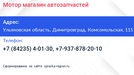 Мотор, магазин автозапчастей по адресу Ульяновская область, Димитровград, Комсомольская, 115 в дальнейшем Организация, размещена в следующих категориях: