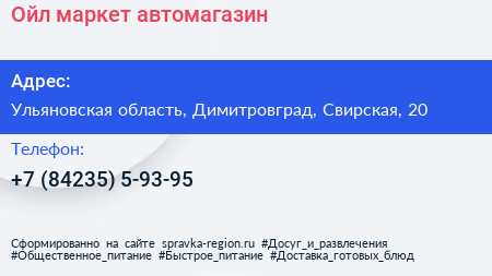 Ойл-маркет, автомагазин по адресу Ульяновская область, Димитровград, Свирская, 20 в дальнейшем Организация, размещена в следующих категориях: