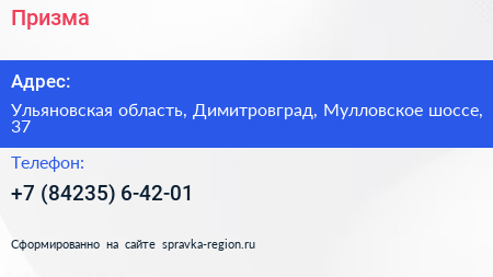 Призма по адресу Ульяновская область, Димитровград, Мулловское шоссе, 37 в дальнейшем Организация, размещена в следующих категориях: