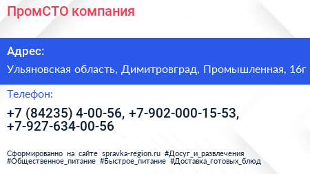 ПромСТО, компания по адресу Ульяновская область, Димитровград, Промышленная, 16г в дальнейшем Организация, размещена в следующих категориях: