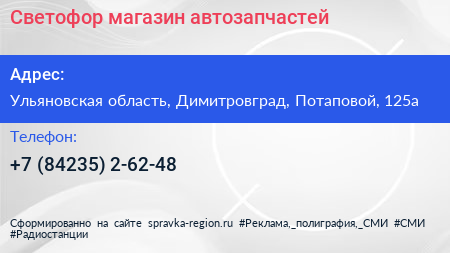 Светофор, магазин автозапчастей по адресу Ульяновская область, Димитровград, Потаповой, 125а в дальнейшем Организация, размещена в следующих категориях: