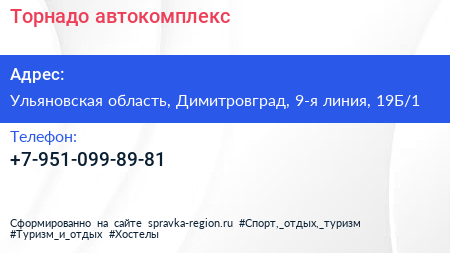 Торнадо, автокомплекс по адресу Ульяновская область, Димитровград, 9-я линия, 19Б/1 в дальнейшем Организация, размещена в следующих категориях:
