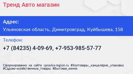 Тренд Авто, магазин по адресу Ульяновская область, Димитровград, Куйбышева, 158 в дальнейшем Организация, размещена в следующих категориях: