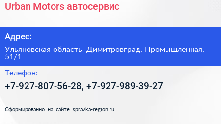 Urban Motors, автосервис по адресу Ульяновская область, Димитровград, Промышленная, 51/1 в дальнейшем Организация, размещена в следующих категориях: