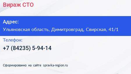 Вираж, СТО по адресу Ульяновская область, Димитровград, Свирская, 41/1 в дальнейшем Организация, размещена в следующих категориях: