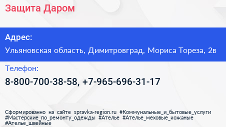 Защита Даром по адресу Ульяновская область, Димитровград, Мориса Тореза, 2в в дальнейшем Организация, размещена в следующих категориях: