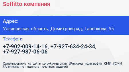 Soffitto, компания по адресу Ульяновская область, Димитровград, Ганенкова, 55 в дальнейшем Организация, размещена в следующих категориях: