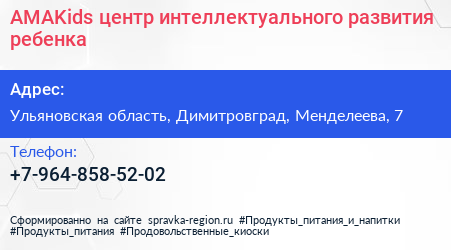 AMAKids, центр интеллектуального развития ребенка по адресу Ульяновская область, Димитровград, Менделеева, 7 в дальнейшем Организация, размещена в следующих категориях: