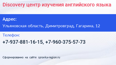 Discovery, центр изучения английского языка по адресу Ульяновская область, Димитровград, Гагарина, 12 в дальнейшем Организация, размещена в следующих категориях: