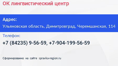 ОК!, лингвистический центр по адресу Ульяновская область, Димитровград, Черемшанская, 114 в дальнейшем Организация, размещена в следующих категориях: