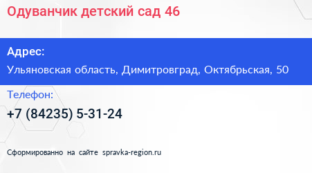 Одуванчик, детский сад №46 по адресу Ульяновская область, Димитровград, Октябрьская, 50 в дальнейшем Организация, размещена в следующих категориях:
