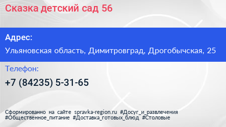 Сказка, детский сад №56 по адресу Ульяновская область, Димитровград, Дрогобычская, 25 в дальнейшем Организация, размещена в следующих категориях: