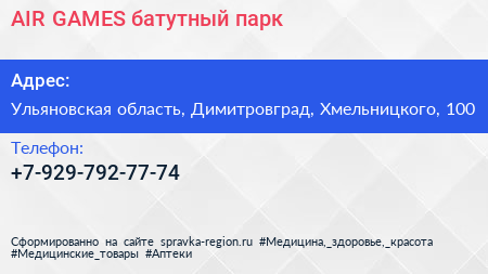 AIR-GAMES, батутный парк по адресу Ульяновская область, Димитровград, Хмельницкого, 100 в дальнейшем Организация, размещена в следующих категориях: