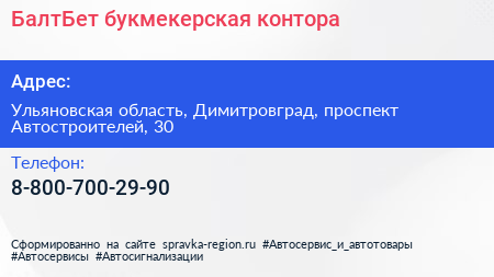 БалтБет, букмекерская контора по адресу Ульяновская область, Димитровград, проспект Автостроителей, 30 в дальнейшем Организация, размещена в следующих категориях: