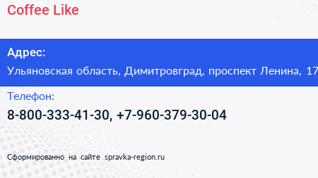 Coffee Like по адресу Ульяновская область, Димитровград, проспект Ленина, 17 в дальнейшем Организация, размещена в следующих категориях: