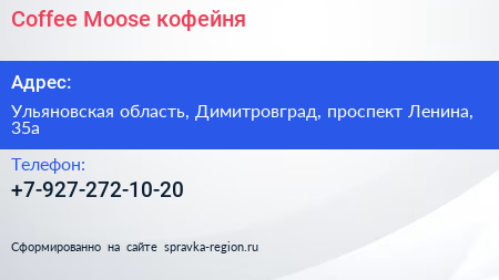 Coffee Moose, кофейня по адресу Ульяновская область, Димитровград, проспект Ленина, 35а в дальнейшем Организация, размещена в следующих категориях: